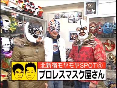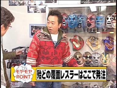 店内に入ると気さくな店主登場。マスクは手作りで1つ1つ作り、タイガーマスクのマスク等も手がけている。
