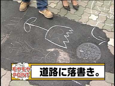 お店の前の歩道にはローセキで書かれた落書きがあった。