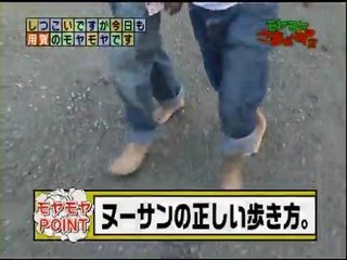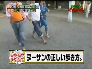 よちよち歩く大江に、ヌーサン本来の歩き方を伝授する大竹三村。